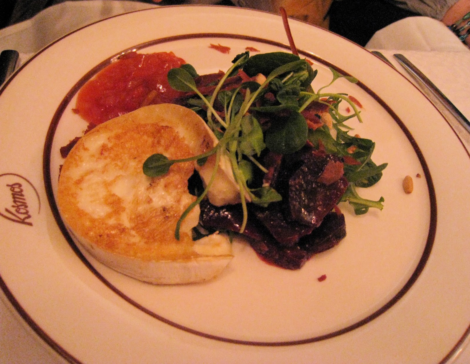 Kosmoksen a la carte -lista on laaja. Alku- ja jälkiruokia oli molempia noin kymmenen eri vaihtoehtoa ja pääruokia vaikka kuinka. Lisäksi oli suosituslista ja suositusmenu. Aloitimme illan kuohuvalla - päivän synttärisankaria näin juhlistaen. Pullo Proseccoa maksoi noin 40 €. Alkuruuista Punajuurisalaattia, vuohenjuustoa, parmankinkkua ja paholaisen hilloa oli kaunis annos, mutta maku ei säväyttänyt. Ricottaraviolit sai pyydettäessä alkuruokana suositusmenulta, mutta olivat maunsa puolesta aika vaisuja. Raviolien kanssa oli pinaattia.