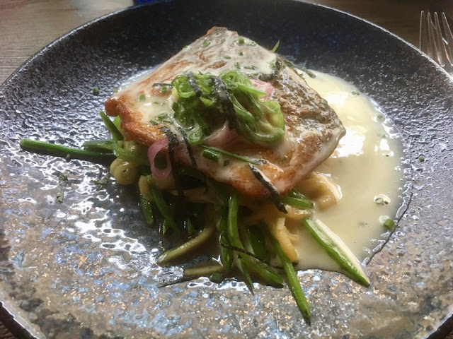 Seuraavaksi oli vuorossa kampasimpukkaa, joka on meidän molempien lempparia. Kampasimpukan vienoa makua korosti ihan mielettömän hyvä vihreä currykastike ja merileväsalaatti.